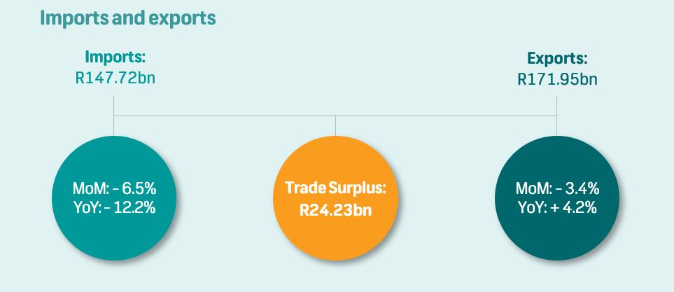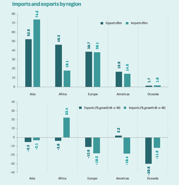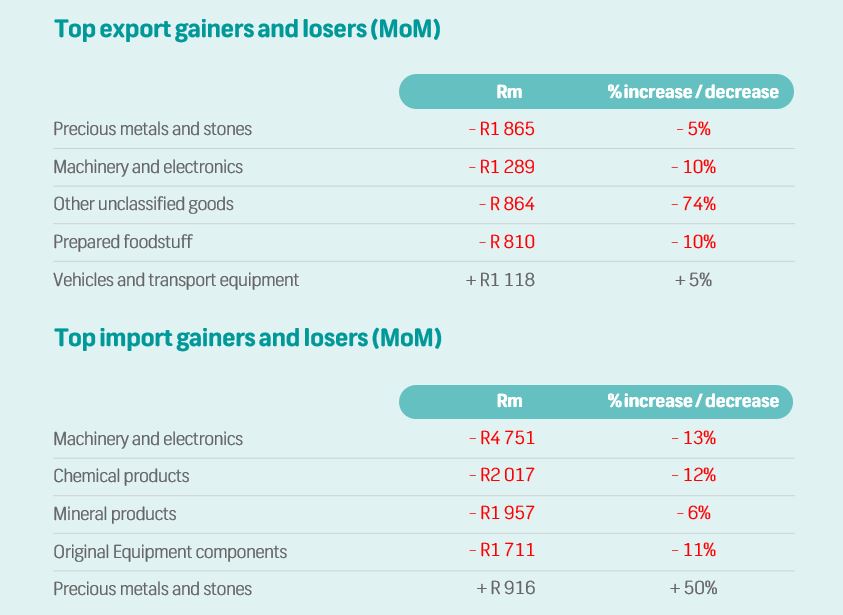 Higher imports were due to increases across several import categories: machinery and electronics, worth R6.6bn, consisting mainly of generators and converters, self-propelled bulldozers, and cell phones; chemical products, worth R3.0bn; and textiles, worth R1.1bn. These healthy import increases were partly offset by a decline in mineral products, worth R2.2bn, consisting mainly of crude oil, worth R1.3bn, and OE component imports, worth R1.5bn.