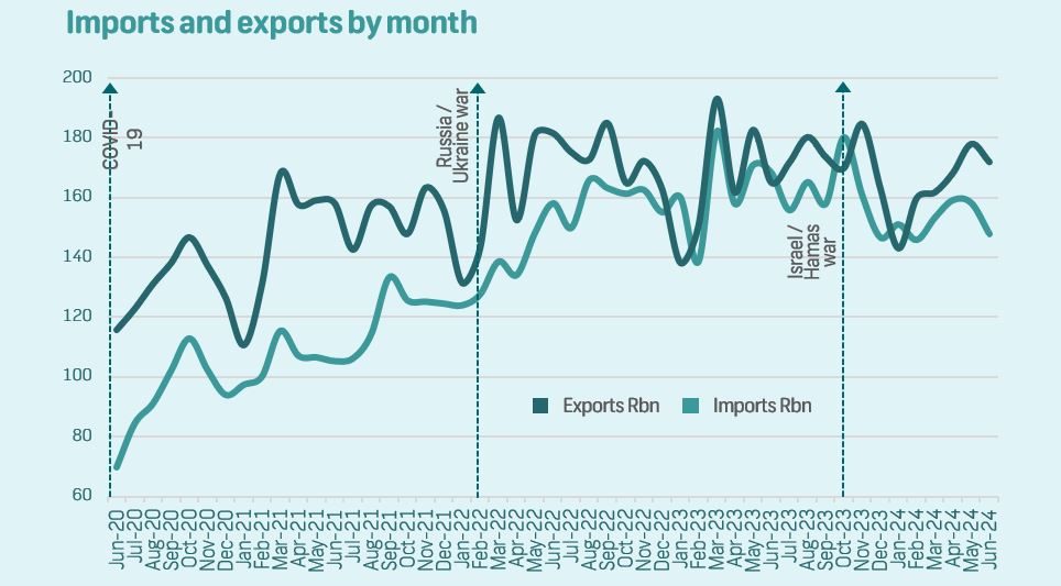 South Africa recorded a trade surplus of R17.6bn in July 2024. Although lower than the R24.2bn surplus posted in the previous month, this was the sixth consecutive month the country returned surpluses. Cumulatively, the surplus for the year stood at R85.3bn, almost three times higher than the surplus for the same period in 2023 but only half of that of 2022, when record-high commodity prices drove exports due to the pandemic.