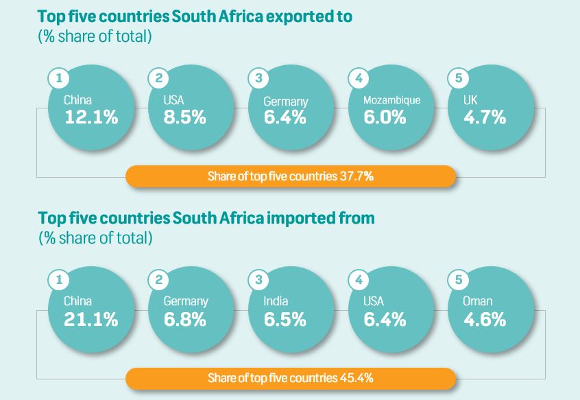 On a country level, China remained the country's top trading partner on both the import and export sides, contributing 23.1% to total country imports and 11.6% to total exports, respectively. The rapid growth in trade relations between the two countries since the democratisation of South Africa is evident: In 1994, China ranked merely as its 13th largest import partner and its 25th export partner, only to jump to the first position by 2009, a position it has ever since held. Within this context, the recent visit by President Ramaphosa to China must be evaluated.