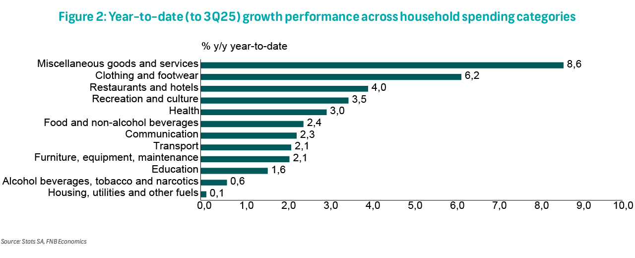 Year-to-date (to 3Q25) real GDP has risen by 1.2%, underpinned by the robust recovery in household consumption amid real income gains from low and stable inflation, pent-up demand, and savings facilitated by interest rate cuts. Real household spending has been robust in categories such as miscellaneous goods and services (up 8.6% year-to-date), clothing and footwear (up 6.2%), restaurants and hotels (up 4.0%), recreation and culture (up 3.5%), and health (up 3.0%).