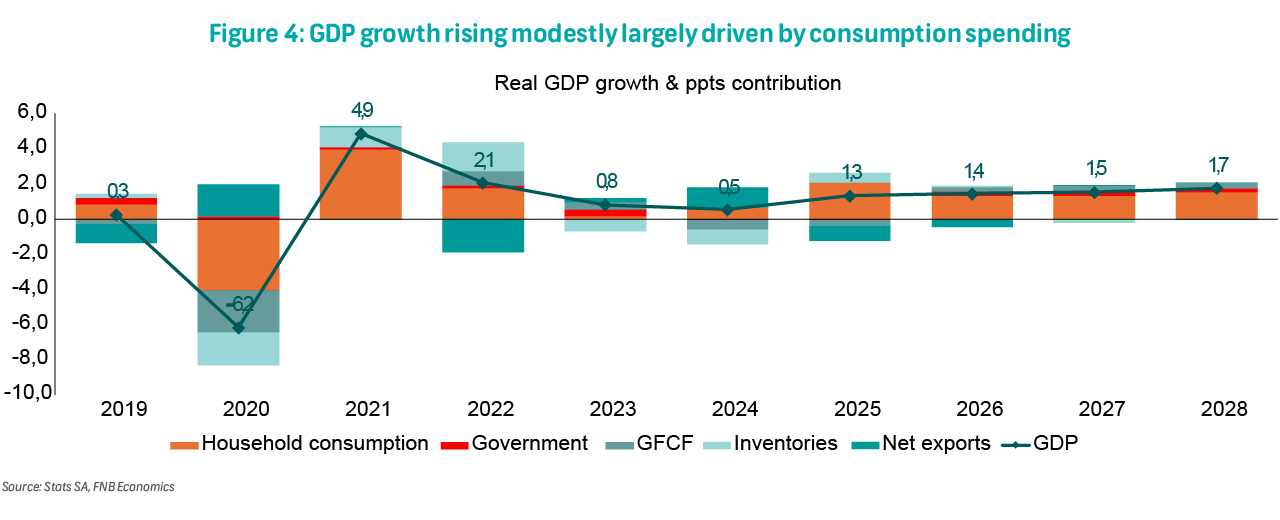 The South African Reserve Bank (SARB) has delivered 150-basis points (bps) of interest rate cuts to date, a substantial easing that has supported household spending, including on productive assets such as new vehicles. We anticipate further, gradual rate cuts from next year, with the repo rate expected to decline to around 6.0% by the end of 2028. Although real rates remain restrictive, the SARB may see this as appropriate in anchoring inflation expectations around the new 3.0% target over the next two years.