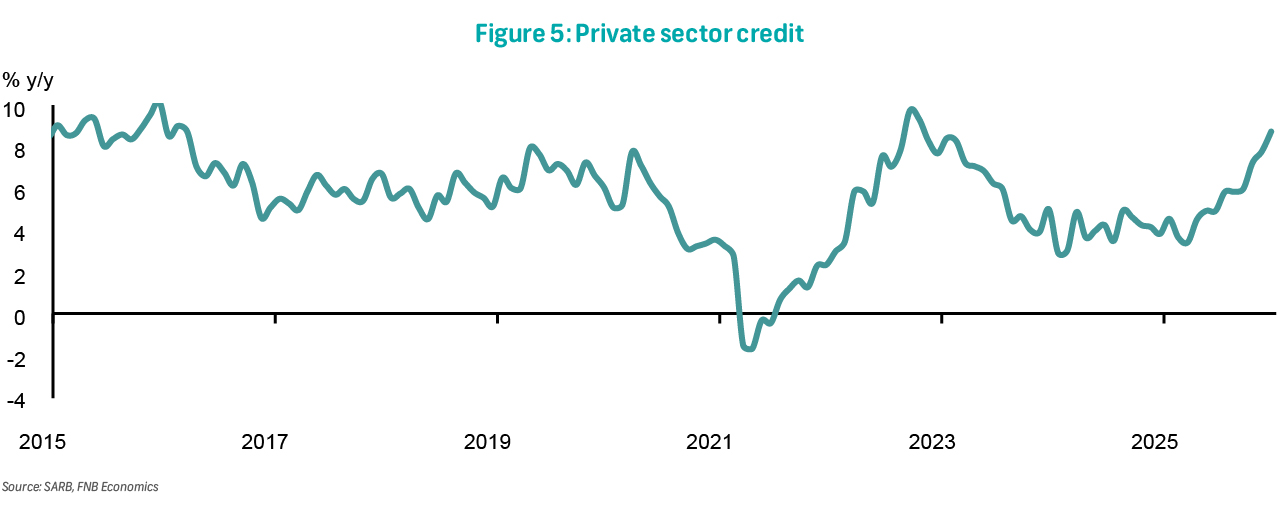 Private Sector Credit Extension (PSCE) growth was 8.7% y/y in December, up from 7.8% in November. Corporate credit continues to lead the surge, rising by 12.9% following an 11.4% increase in the previous month. Within corporate credit, the largest contribution came from general loans and advances, which increased by 16.2% y/y compared to 16.7% in November. Growth in corporate mortgage advances was steady at 6.6%. In other corporate credit categories, slight increases were noted in vehicle asset finance (7.4% y/y, previously 6.8%) and overdrafts (5.2% y/y, previously 3.1%). Household credit growth lifted to 3.7% y/y, up from 3.5% in November. Changes within the household segment were mostly minor, with slight increases noted in general loans and advances (2.2% y/y, previously 1.2%), car finance (8.1% y/y, previously 7.8%) and leasing finance (16.3% y/y, previously 15.6%). Overdrafts continued into negative territory, coming in at -8.0% compared to -8.7% previously. Households are showing a cyclical recovery; however, monetary policy remains restrictive and is ultimately weighing on lending appetite and credit uptake.