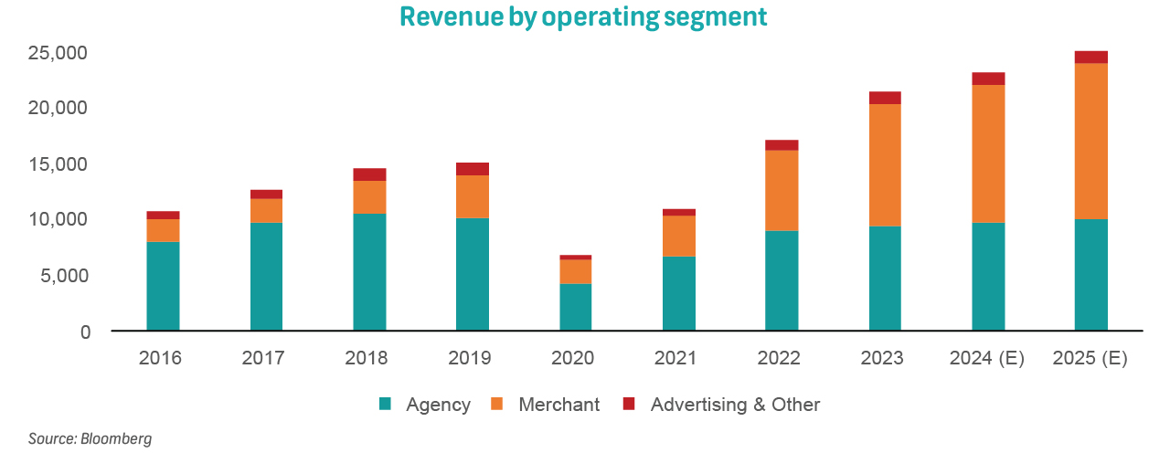 Booking trends pre-and-post 2020 have notably changed for the company. Before 2020, Agency bookings accounted for over 65% of total revenue, being as high as 77% in 2017. It accounted for only 44% of revenue in 2023. Meanwhile, the Merchant segment accounted for 19% of revenue share in 2016, but 51% in 2023. Merchant gross bookings have been increasing at a faster rate than agency bookings (FY23: +52% vs +5%). A reason for this could be that travellers prefer to make payments through a trusted booking platform and to have a one-stop-shop for making and paying for bookings.