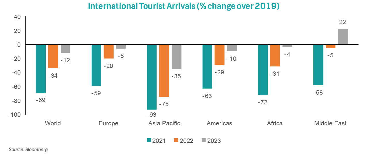 According to the first UNWTO World Tourism Barometer of 2024, international tourism ended 2023 at 88% of pre-pandemic levels, and is well on track to return to pre-pandemic levels in 2024. According to the barometer, the Middle East is the only region that has surpassed 2019 levels. There is still significant room for recovery across Asia, while travel from the United States is expected to be backed by strength in the greenback, and Europe should continue to benefit from intra-regional demand and travel from the United States.