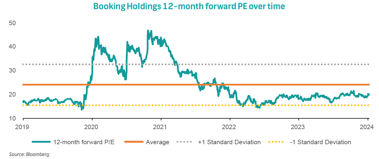 Booking Holdings is trading on 20.0 times forward PE, still below its longer-term average rating. The company trades at a premium to its peers but we believe this is justified given its comprehensive business model, scale, and market share.