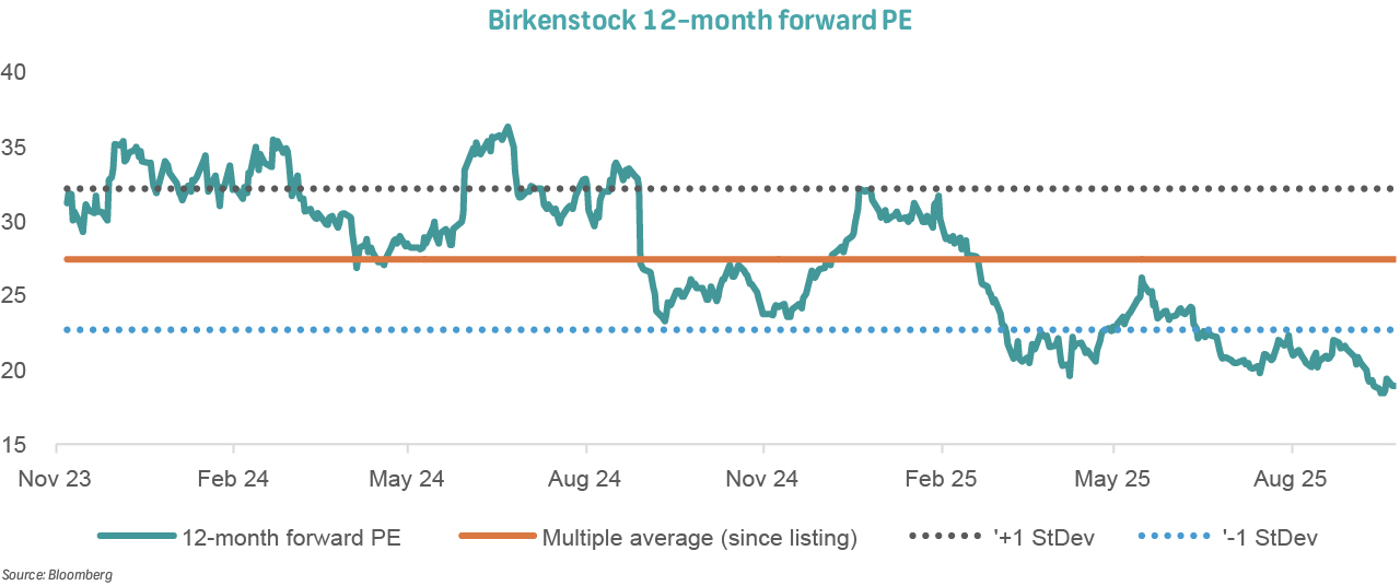 Birkenstock maintains an ambitious yet measured outlook. Investments in capacity, digital infrastructure, and new product lines are expected to drive further market share gains, particularly in North America and APAC. The focus will remain on scaling the DTC business, deepening brand engagement, and executing a disciplined international rollout. Consensus is looking for adjusted earnings growth of 34% in FY25, 23.1% in FY26, and 20.8% in FY27.
