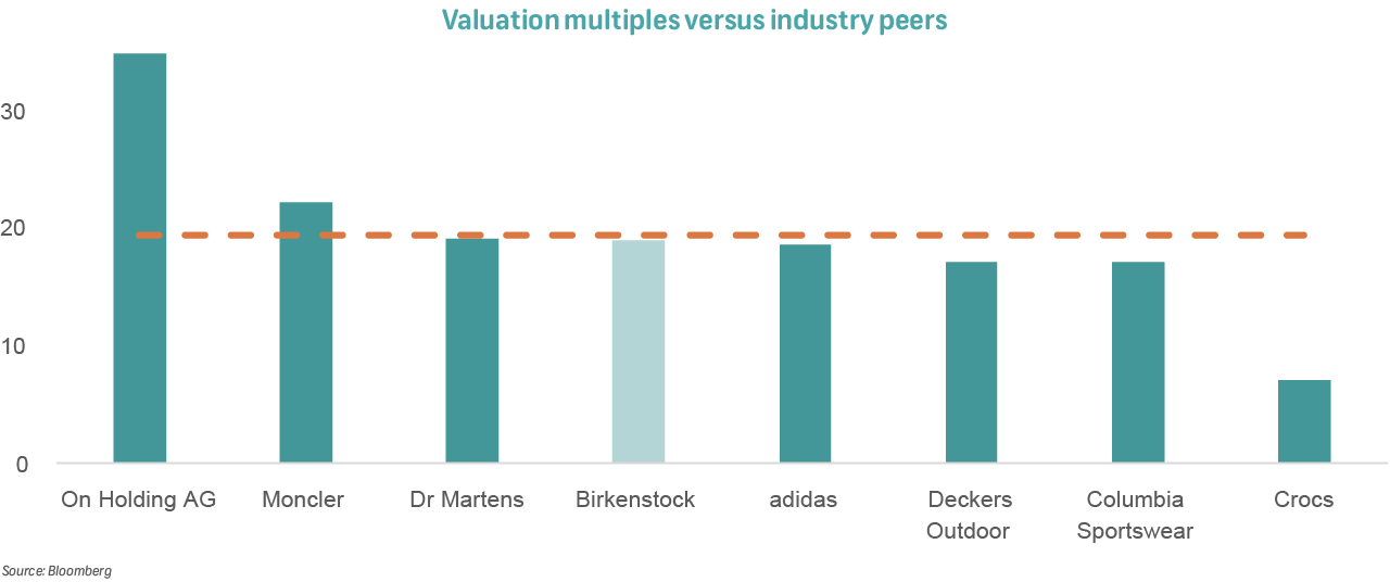 Birkenstock is trading at a forward PE ratio of 18.5 times, representing a discount to both its long-term average of 24.5 times and slightly below peers (where it has previously traded at a premium). Earnings growth forecasts are still well ahead of peers.