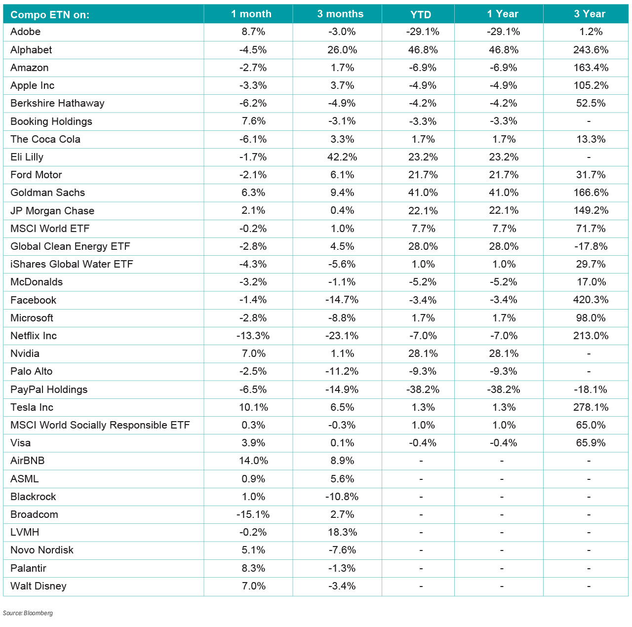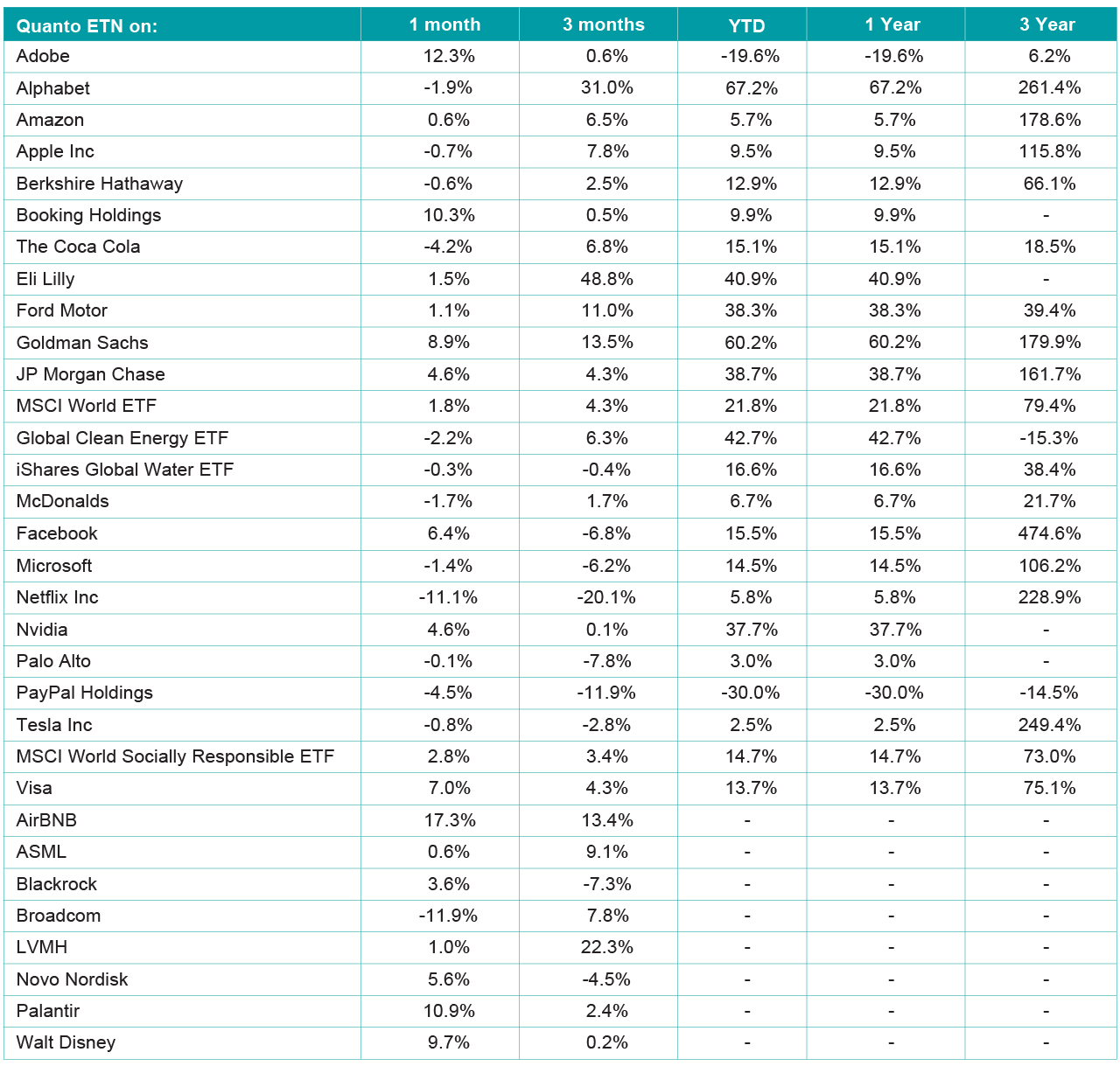 The notable quarterly outperformers within the ETN basket were Eli Lilly (+49%) who benefitted from robust demand for its diabetes and obesity drugs, Zepbound and Mounjaro, while Alphabet rose 31% driven primarily by the breakout success of Gemini 3, its frontier AI model, as well as very strong cloud demand, all while a federal judge ruled that Google could retain control of Chrome and Android, eliminating the risk of a forced breakup. LVMH also had a strong quarter as modest, but consensus beating, sales figures reflected a sequential recovery across most business groups and geographies.