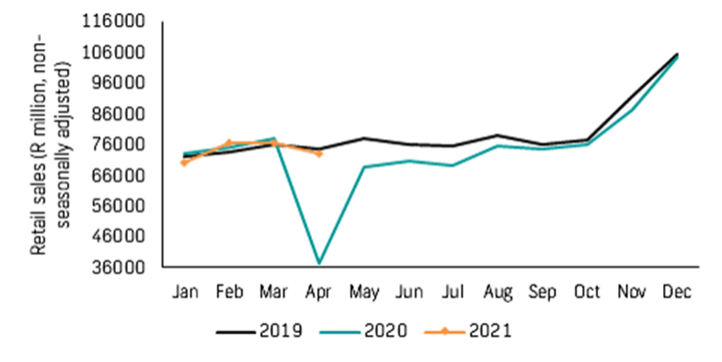 Figure 1: Solid year-on-year growth in retail sales off the low base in April 2020