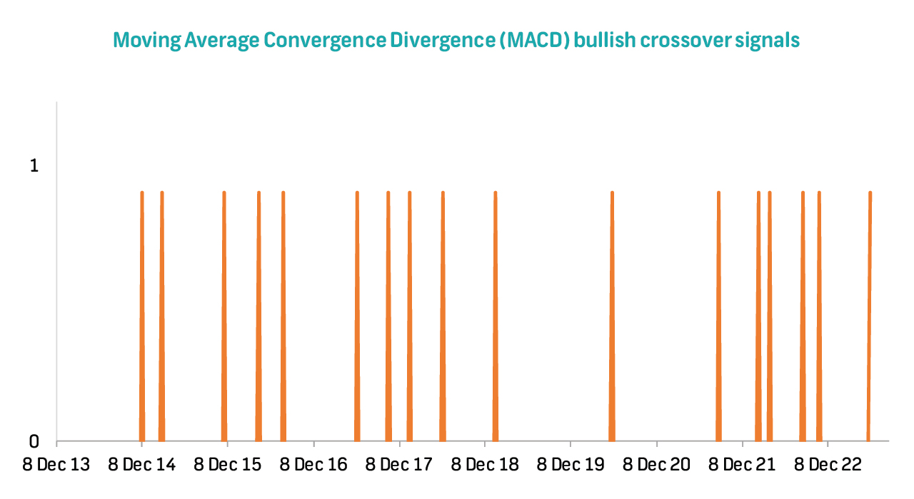 The stock is trading just below its 200-day simple moving average (SMA) of $55.80, with upward price momentum as indicated by the Moving Average Convergence Divergence (MACD) indicator. This supports the bullish bias. The Coppock Curve echoes a similar analysis.