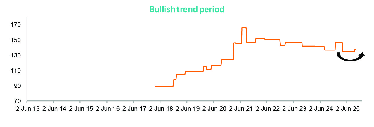 | Comment | Strong price action supported by a rising Volume Price Trend (VPT) and sustained accumulation highlights continued upside potential after consolidation. The price remains above the 200-day SMA, while fading downside momentum supports the trade. Profit target is R345.00, with stop-loss at R288.00 and trailing stop at R300.00. | Price action holding above key support remains of interest, with levels sustained above the 200-day SMA. Renewed upside momentum supports the trade strategy. Profit target is maintained at R261.00, with an initial stop-loss at R223.00 and trailing stop at R236.00. | A gross dividend of R0.633 will trade ex-dividend on 15 October 2025. Price action remains near the upper range of its price distribution and above the 200-day SMA. However, fading upside momentum poses concern. Profit target is R16.00, with stop-loss at R12.00 and trailing stop at R13.40. |