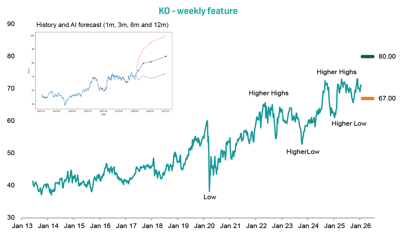Technically, an upward-sloping expected price path across all forecast horizons, and upside outcomes dominating the confidence bands, signals a potential investment opportunity for the stock (see the insert on the main chart). This pattern highlights an AI forecasting model that applies a Gradient Boosting framework to seven years of adjusted price data, incorporating trend, momentum, volatility and cycle-based technical features to project probabilistic price paths with 80% confidence bands.