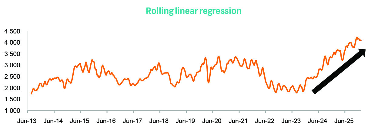 | Comment | An emerging Elliott Wave B recovery remains of interest. Although the price dipped below its 200-day simple moving average, fading downside momentum supports the trade. Our profit target remains R1 352.00, with an initial stop-loss at R1 038.00 and a trailing stop at R1 090.00. | A stable pattern of rising troughs and repeated upward impulses remains of interest, with the price holding above its 200-day simple moving average. However, fading upside momentum is a concern. Our profit target remains R42.00, with an initial stop-loss at R35.00 and a trailing stop at R37.60. | Price action near the lower boundary of an upward-sloping linear regression remains of interest, despite trading below the 200-day simple moving average. Muted downside momentum supports the trade. Our profit target remains R307.00, with an initial stop-loss at R262.00 and a trailing stop at R276.00. | Based on its historical tendency for strong follow-through after recovery years and an improving return profile into 2025, the outlook for continued upside in 2026 remains favourable. The price holds above its 200-day simple moving average, although fading upside momentum is a concern. Our profit target remains R110.00, with an initial stop-loss at R89.00 and a trailing stop at R97.50. |