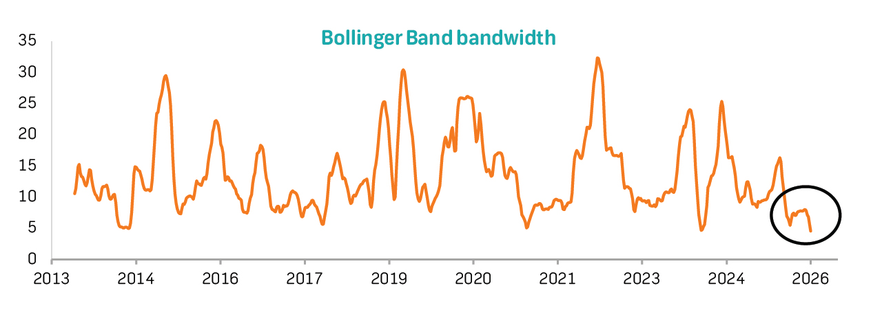 • The sharp contraction in Bollinger Bandwidth (shown in the lower panel) signals a period of low volatility that often precedes a strong directional move. With the price holding above the 200-day SMA, this squeeze likely reflects consolidation within an improving trend. Historically, similar bandwidth troughs have preceded upside breakouts, suggesting that the current compression may set the stage for a bullish move if volume expands and the price clears near-term resistance.