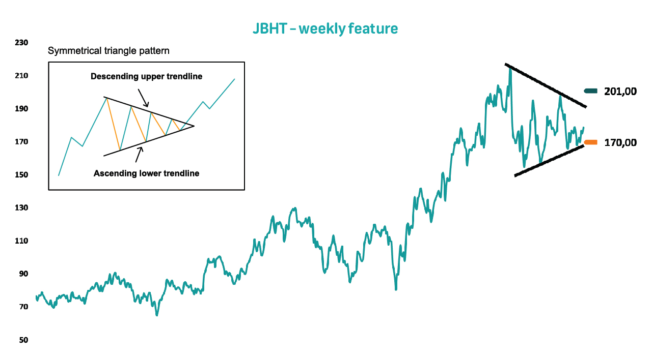 Technically, a symmetrical triangle pattern in an uptrend makes the stock attractive as an investing option (see the black converging trendline on the main chart as well as insert). The pattern indicates that buyers are consistently stepping in at higher lows, demonstrating their willingness to support the price even during the consolidation phase.