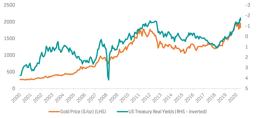 Gold versus US treasury real yields (inverted)